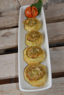Rull så sammen butterdeigen din og del den så opp i i ca 2 cm tykke skiver,bruk en skarp kniv og tørk av den mellom hver gang du skjærer slik at du ikke får pesto på utsiden av rullene.